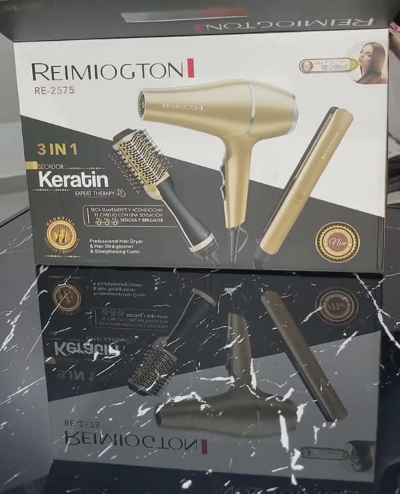 Transforma tu cabello con el Combo Keratina 3 en 1: Cepillo Secador, Plancha y Secador, diseñado para secar, alisar y dar volumen de forma rápida y profesional desde casa.